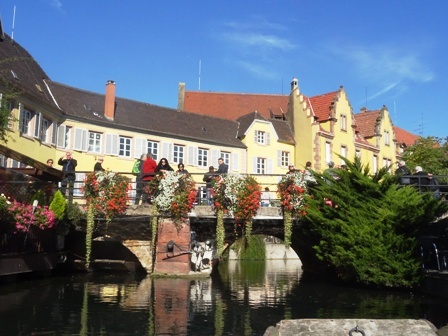 Colmar, one of the largest and prettiest towns in the area, is a direct train ride from Strasbourg. We planned to spend the day exploring just one town so we wouldn’t need a car. It was an easy half-hour that landed us within a short walk to the center of the historic town. We wandered the streets, admiring the many large Alsatian buildings, churches and museums. A band from another town arrived and set up a corner in the center and treated us to a selection of marching and waltz tunes. Other musicians entertained us on a corner by the canal and beside an outdoor patio where we were enjoyed our afternoon refreshment. Boat tours are always fun and the canal running through Colmar was no exception. The slow ride along the waterway gave us a different view of the towns many half-timbered Medieval and Early Renaissance buildings. We skipped the museums but did visit the interior of some of the many churches, each with something unique to entice us in.Read about our visit to Strasbourg