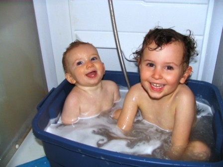 no bath tub so a Rubbermaid box is just big enough for two