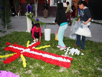 During the night the route of the parade through San Miguel is decorated elaborately by various neighbourhood parishes. Carpets of flower petals, coloured wood chips and fragrant herbs, fennel, camomile and other herbs cover the pavement. Some sections are works of art, depicting religious scenes. Wires are strung above the street and hung with balloons, crepe paper flowers and other decorations. Big arches are constructed and stands holding bouquets of flowers line the streets. It is a sight to be seen. Ray woke us up about 6 AM and we walked over to the church where many people were sleeping beside the road. Food stands were starting to appear and more and more people were gathering. We walked north along the route to see the decorations. The skies echoed with exploding firecrackers, announcing that the procession was starting down long Independencia Avenue. We joined the crowd, led by young girls and boys in first communion outfits, a brass band playing dirge-like music, altar boys, a group dressed in Roman soldier outfits, carrying whips, priests and the sculptures, carried on palanquins. The Virgin Mary was carried mostly by women, while the other two figures were carried by men. The procession stopped just past the bridge at the intersection of Independencia and San Antonio Abad for a short mass, piped over loud speakers to the crowd of worshippers. We followed the procession back to San Juan de Dios church and then took our leave.