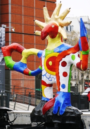 The esplanade of the Georges Pompidou Center, near the Clock, was awash with student groups and buskers. I spied an didgeridoo player sitting on the concrete playing very well. When asked, she admitted she was French, not Aussie. I left a tip because it is a difficult instrument to play and she played very well. A juggler had a large English speaking school group watch him try to catch a spoon in a cup balanced on his head. He finally succeeded after several tries. Another man created giant soap bubbles between two lengths of rope. One man, sitting peacefully eating a nutritious meal of fruit and veggies, had a huge pile of junk, his art work, balanced precariously on a shopping cart beside him. I took his photo and tried to give him a tip, but he didn’t have a hat or cup ready to accept money.